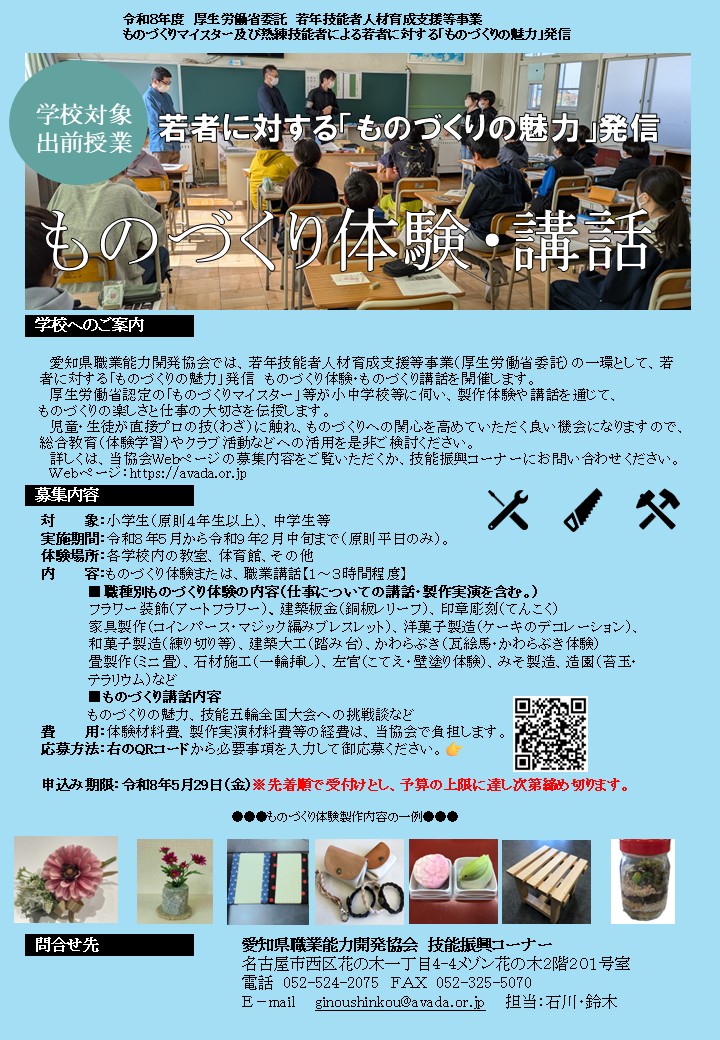 愛知県職業能力開発協会では、若年技能者人材育成支援等事業(厚生労働省委託)の一環として、若者に対する「魅力発信」ものづくり体験・ものづくり講話を開催します。