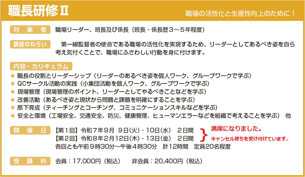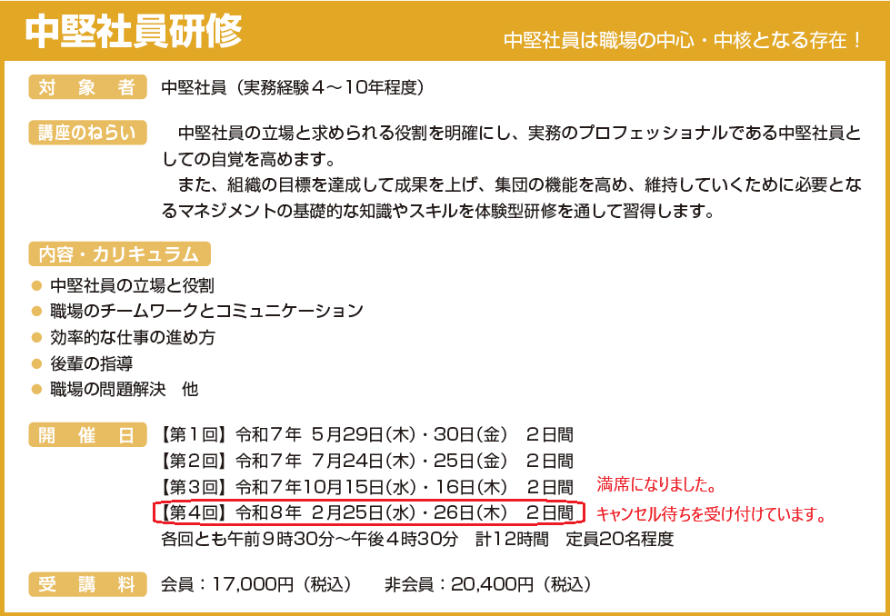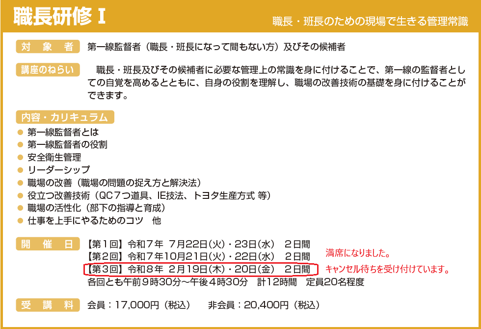 職長研修Ⅱ(満席)、 管理者研修(満席)、 職長研修Ⅰ(満席)、 中堅社員研修(満席)