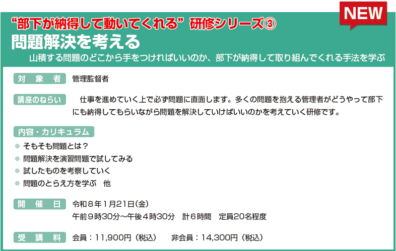 1月開講 :監督者安全衛生教育(職長教育)、”部下が納得して動いてくれる”研修シリーズ③「問題解決を考える」
