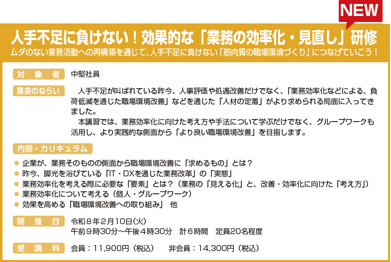 2月開講 :人手不足に負けない!効果的な「業務の効率化・見直し」研修、