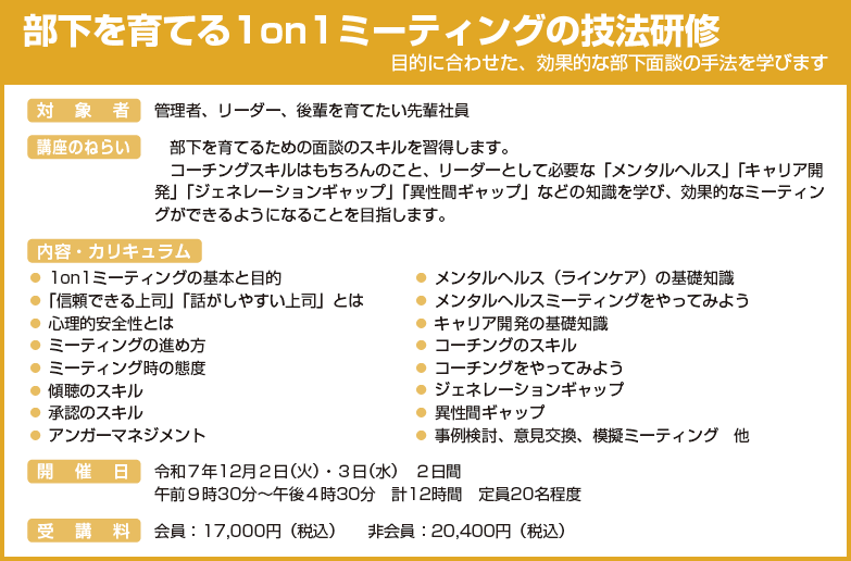 12月開講 :部下を育てる1on1ミーティングの技法研修、新入社員フォローアップ研修(満席)