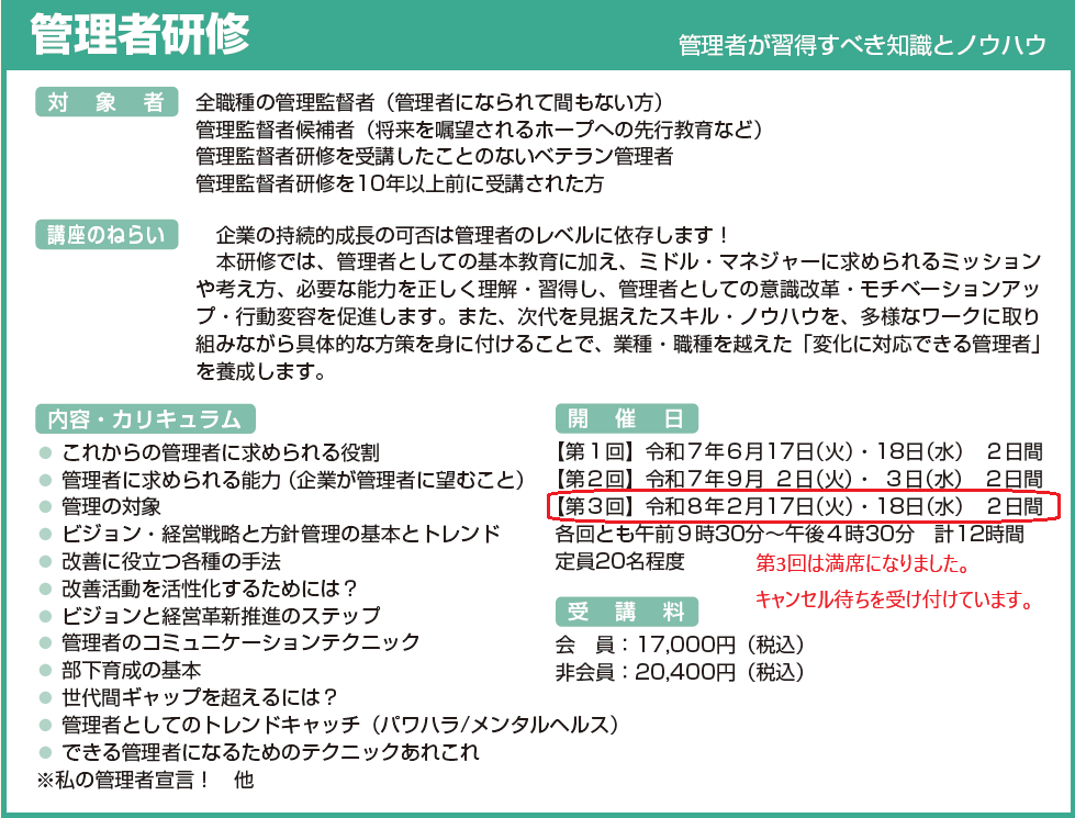職長研修Ⅱ(満席)、 管理者研修(満席)、 職長研修Ⅰ(満席)、 中堅社員研修(満席)